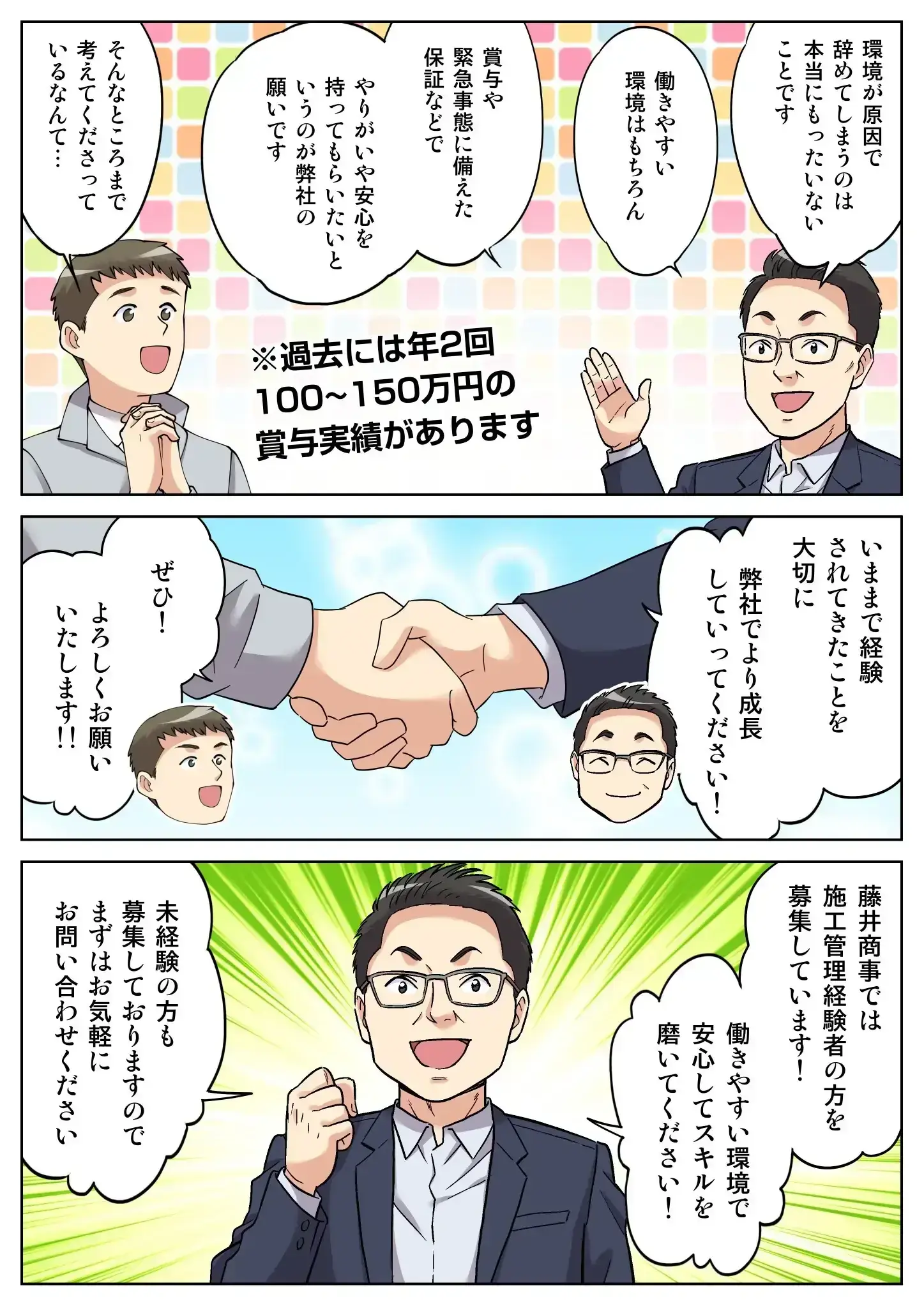 現場によっては夜勤も発生します。その場合は必ず夜勤手当と代休を保証いたします。働きがいと報酬を両立させましょう。